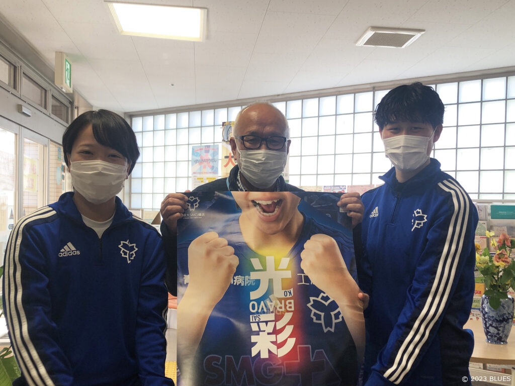 今シーズンの入場チケットの絵を描いてくださったあおば地域活動ホーム「すてっぷ」(横浜市青葉区青葉台)のにっしーさんに、新キャプテンの富岡千宙選手と、学生統括の小松崎可那子選手が招待券をお届けにあがりました。